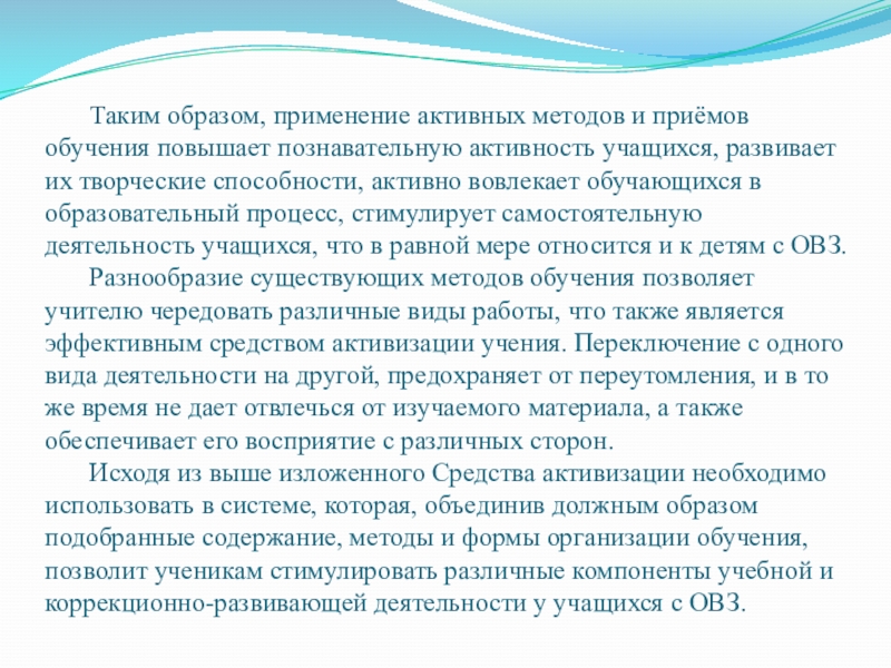 Исходя из выше изложенного Средства активизации необходимо использовать в системе, которая, объединив должным образом подобранные содержание, методы и формы организации обучения, позволит ученикам стимулировать различные компоненты учебной и коррекционно-развивающей деятельности у учащихся с ОВЗ.