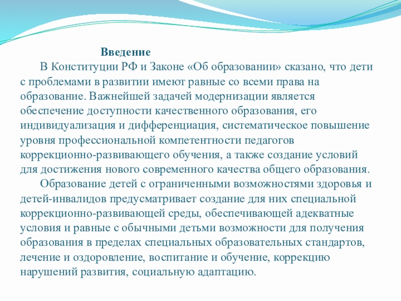проблемами в развитии имеют равные со всеми права на образование. Важнейшей задачей модернизации является обеспечение доступности качественного образования, его индивидуализация и дифференциация, систематическое повышение уровня профессиональной компетентности педагогов коррекционно-развивающего обучения, а также создание условий для достижения нового современного качества общего образования.