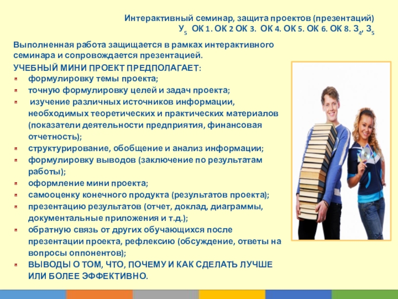 Выполненная работа защищается в рамках интерактивного семинара и сопровождается презентацией.