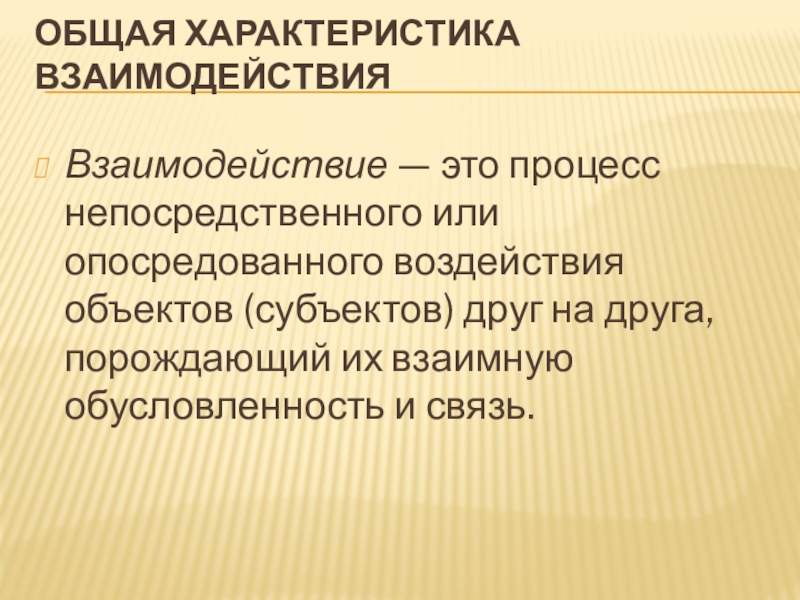Общая характеристика взаимодействия  Взаимодействие — это процесс непосредственного или опосредованного воздействия объектов (субъектов) друг на друга,