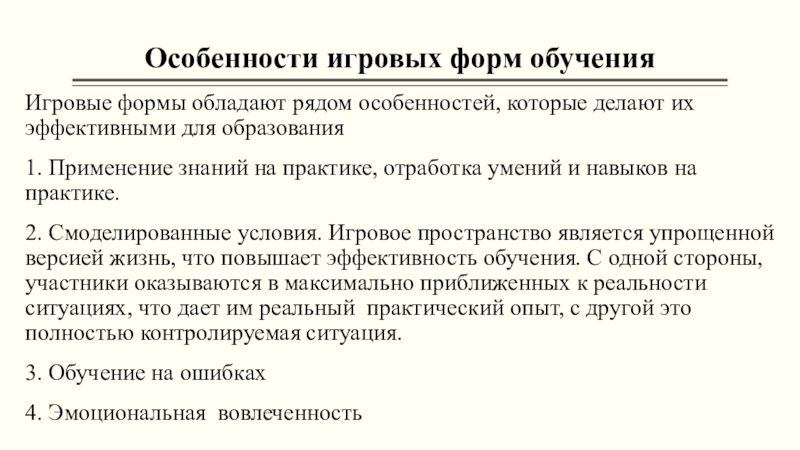 2. Смоделированные условия. Игровое пространство является упрощенной версией жизнь, что повышает эффективность обучения. С одной стороны, участники оказываются в максимально приближенных к реальности ситуациях, что дает им реальный практический опыт, с другой это полностью контролируемая ситуация.