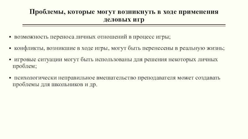 Слайд 16Проблемы, которые могут возникнуть в ходе применения деловых игр