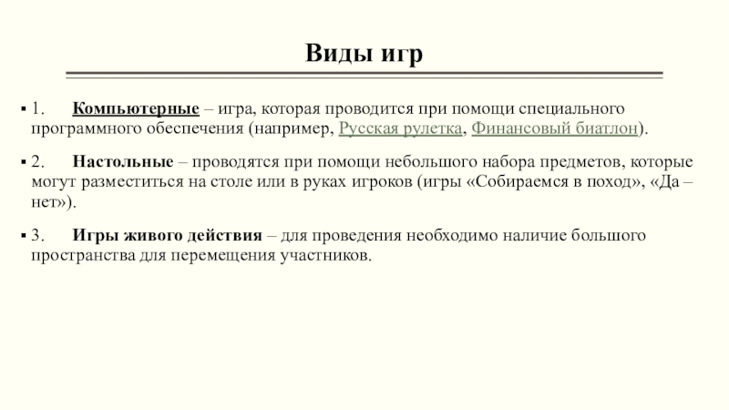 1. Компьютерные – игра, которая проводится при помощи специального программного обеспечения