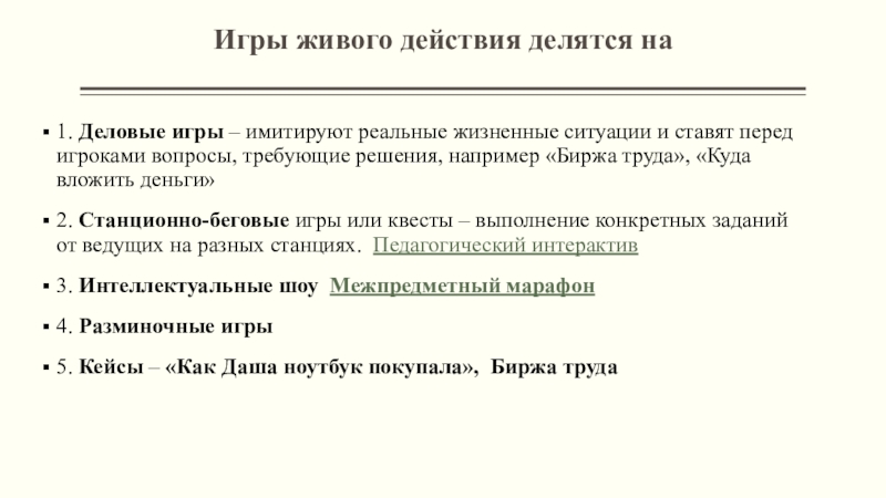 3. Игры живого действия – для проведения необходимо наличие большого пространства для перемещения участников.