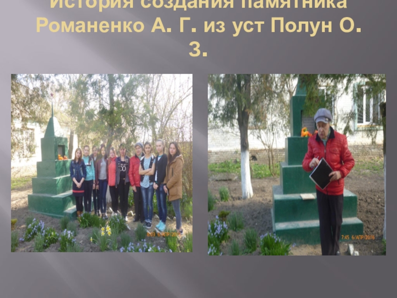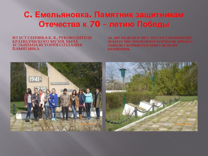 За две недели в 1985 г по составленному эскизу местный венгр Кормачи Арпат с сыном своими руками сделали памятник