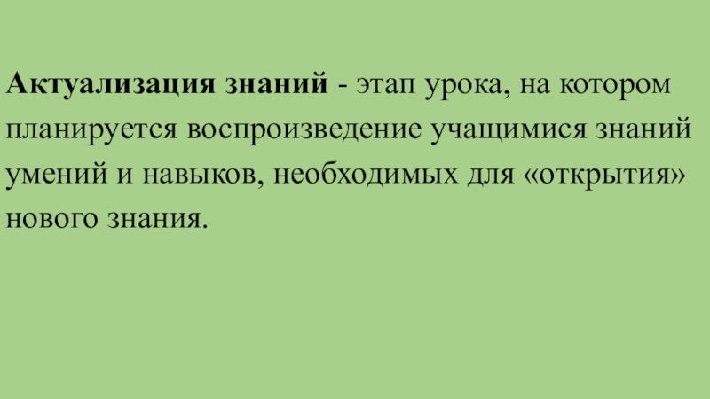 Актуализация знаний - этап урока, на котором планируется воспроизведение учащимися знаний умений и навыков, необходимых для «открытия»