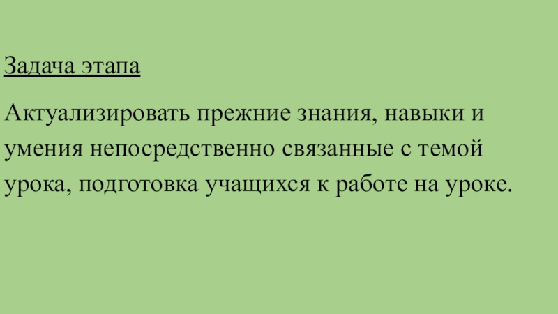 Задача этапаАктуализировать прежние знания, навыки и умения непосредственно связанные с темой урока, подготовка учащихся к работе на