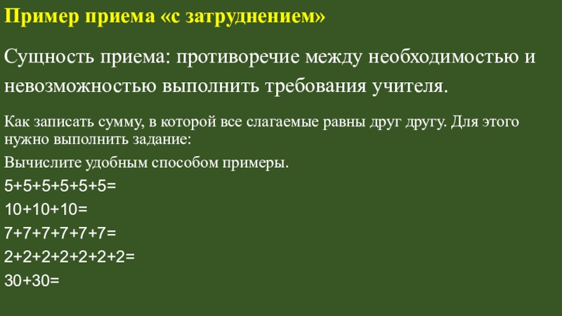 Пример приема «с затруднением»Сущность приема: противоречие между необходимостью и невозможностью выполнить требования учителя.Как записать сумму, в которой
