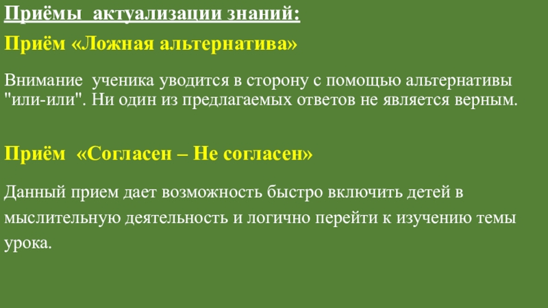 Приёмы актуализации знаний:Приём «Ложная альтернатива»Внимание ученика уводится в сторону с помощью альтернативы