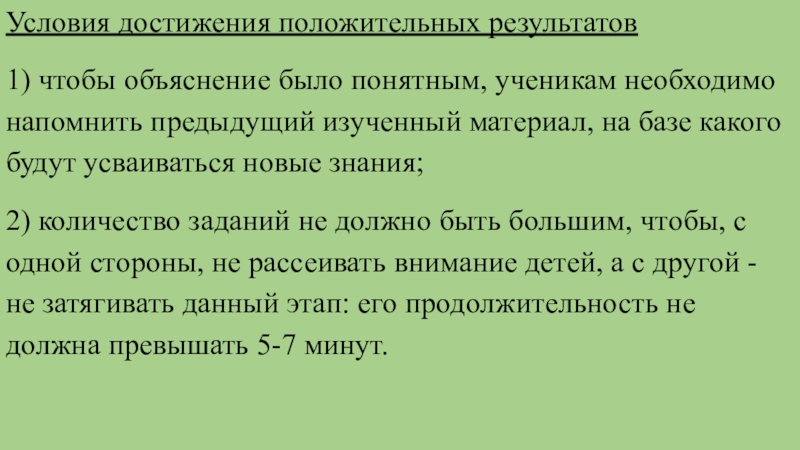 Условия достижения положительных результатов1) чтобы объяснение было понятным, ученикам необходимо напомнить предыдущий изученный материал, на базе какого