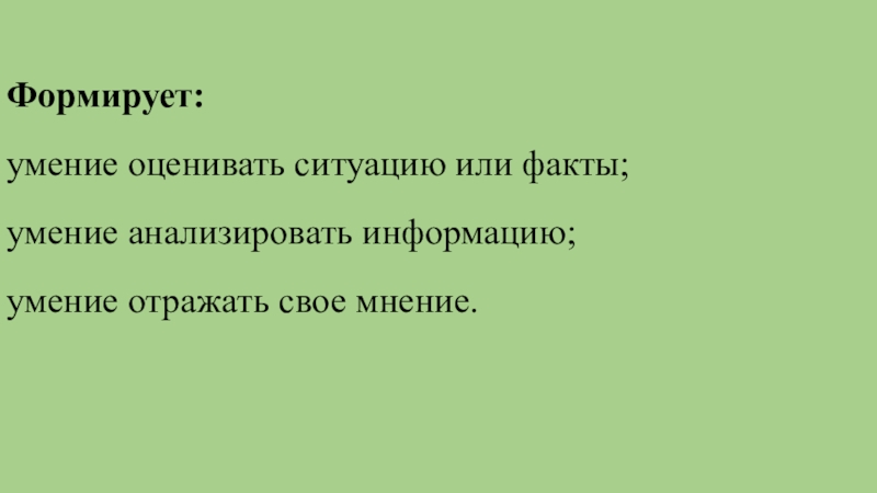Формирует: умение оценивать ситуацию или факты; умение анализировать информацию; умение отражать свое мнение.