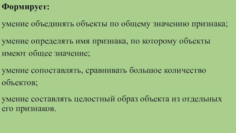 Формирует: умение объединять объекты по общему значению признака; умение определять имя признака, по которому объекты имеют общее