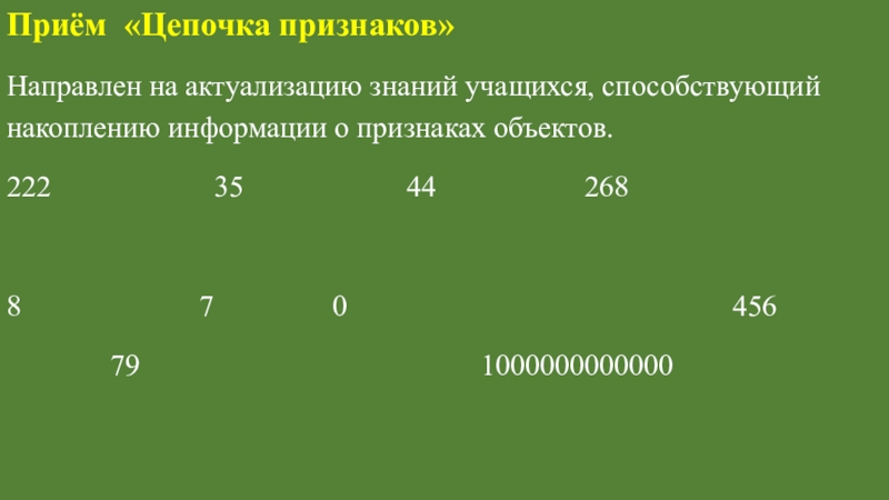 Приём «Цепочка признаков»Направлен на актуализацию знаний учащихся, способствующий накоплению информации о признаках объектов. 222