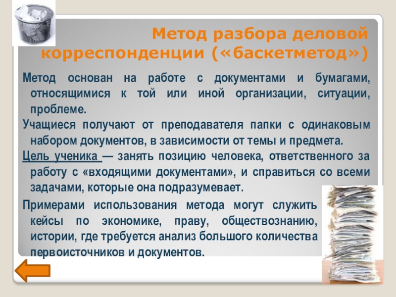 Примерами использования метода могут служить кейсы по экономике, праву, обществознанию, истории, где требуется анализ большого количества первоисточников и документов.