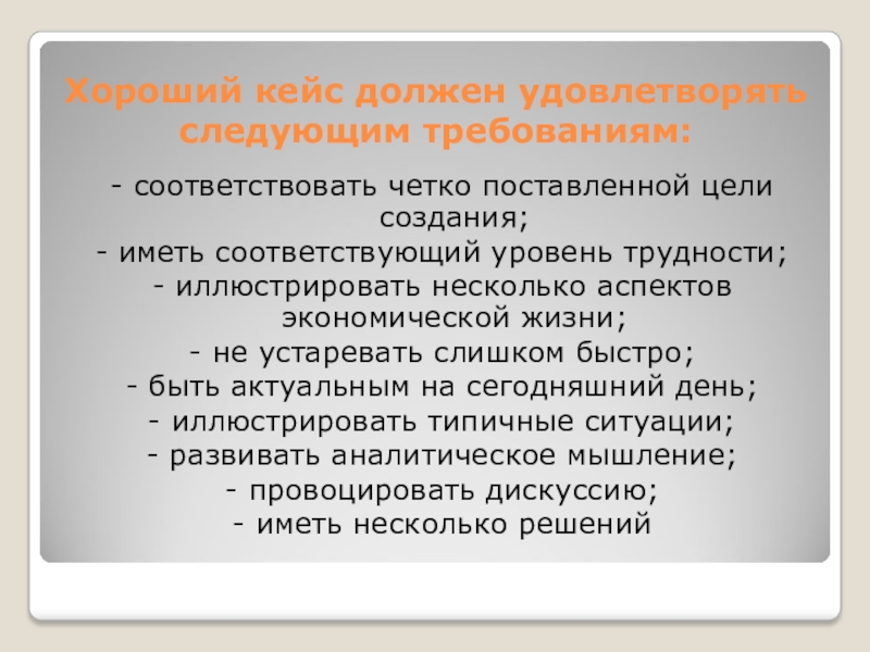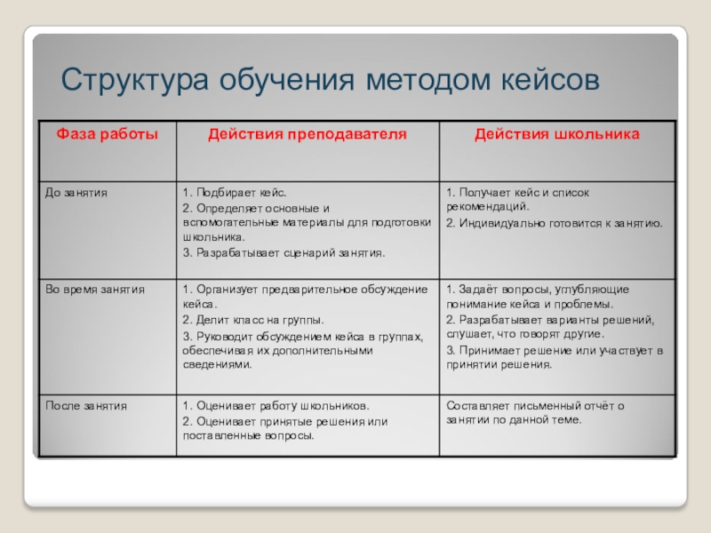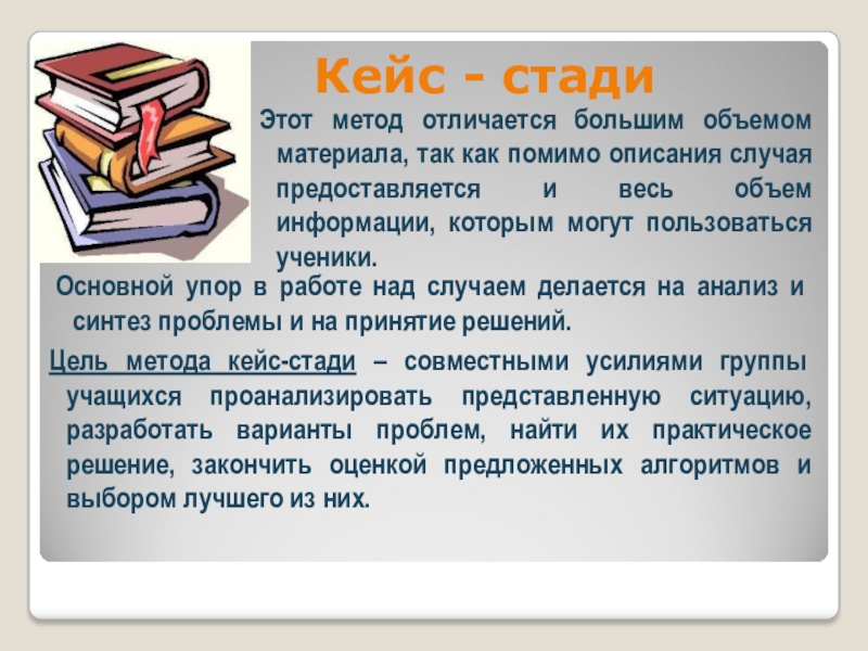 Цель метода кейс-стади – совместными усилиями группы учащихся проанализировать представленную ситуацию, разработать варианты проблем, найти их практическое решение, закончить оценкой предложенных алгоритмов и выбором лучшего из них.