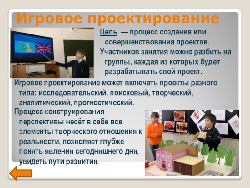 Игровое проектирование может включать проекты разного типа: исследовательский, поисковый, творческий, аналитический, прогностический.