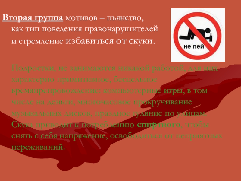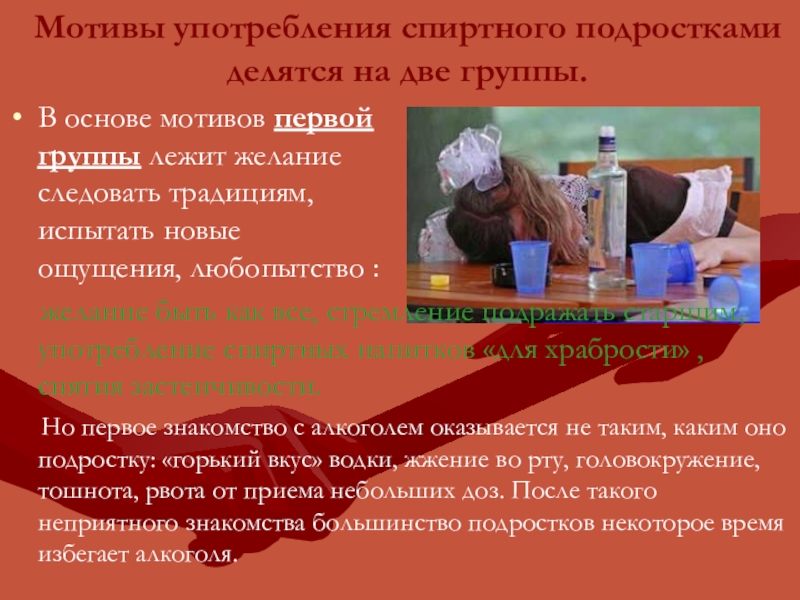 Слайд 32Мотивы употребления спиртного подростками делятся на две группы.