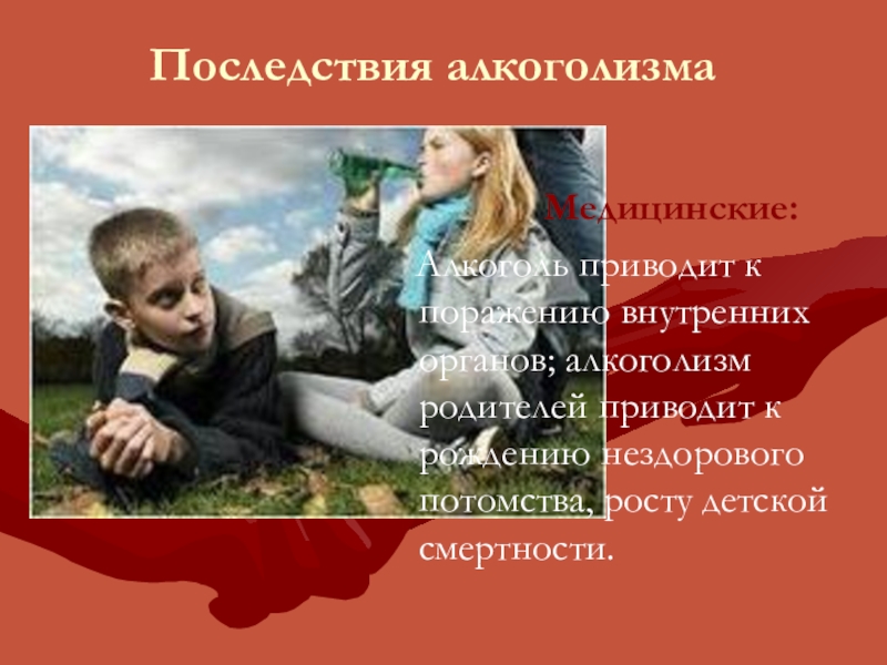 Алкоголь приводит к поражению внутренних органов; алкоголизм родителей приводит к рождению нездорового потомства, росту детской смертности.