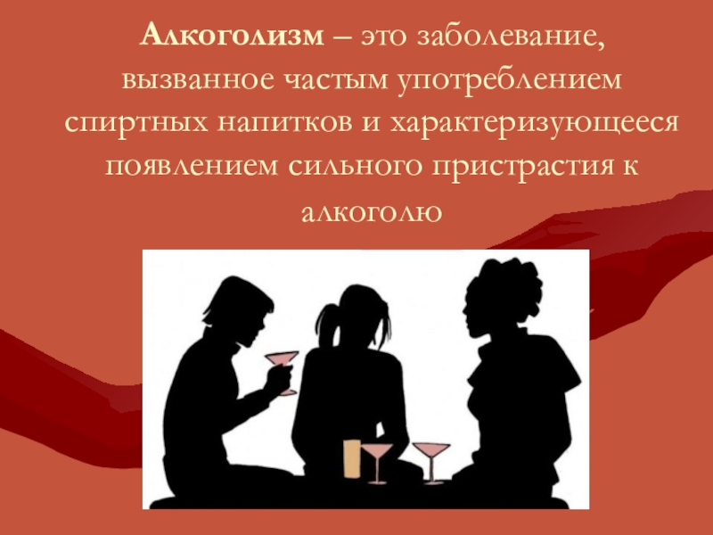 Слайд 2Алкоголизм – это заболевание, вызванное частым употреблением спиртных напитков и характеризующееся