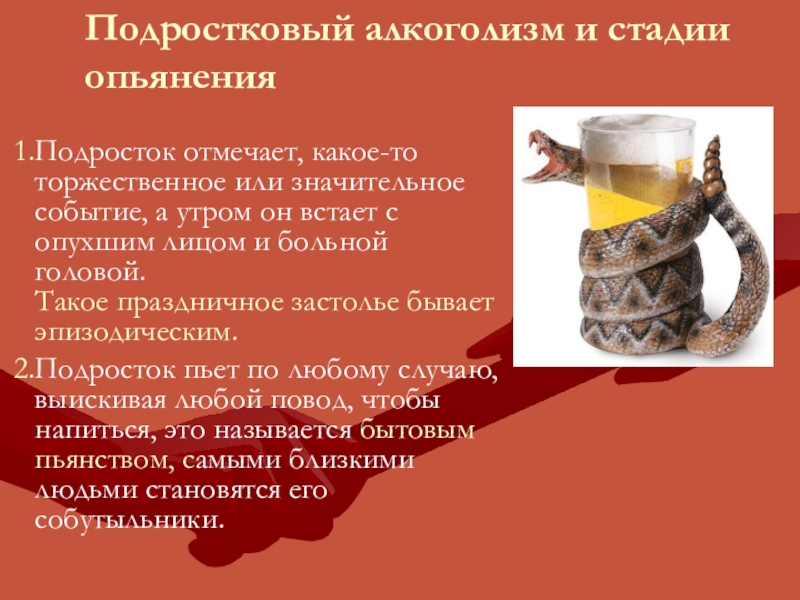 Подросток пьет по любому случаю, выискивая любой повод, чтобы напиться, это называется бытовым пьянством, самыми близкими людьми становятся его собутыльники.