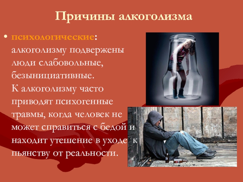 алкоголизму подвержены люди слабовольные, безынициативные. К алкоголизму часто приводят психогенные травмы, когда человек не может справиться с бедой и находит утешение в уходе к пьянству от реальности.