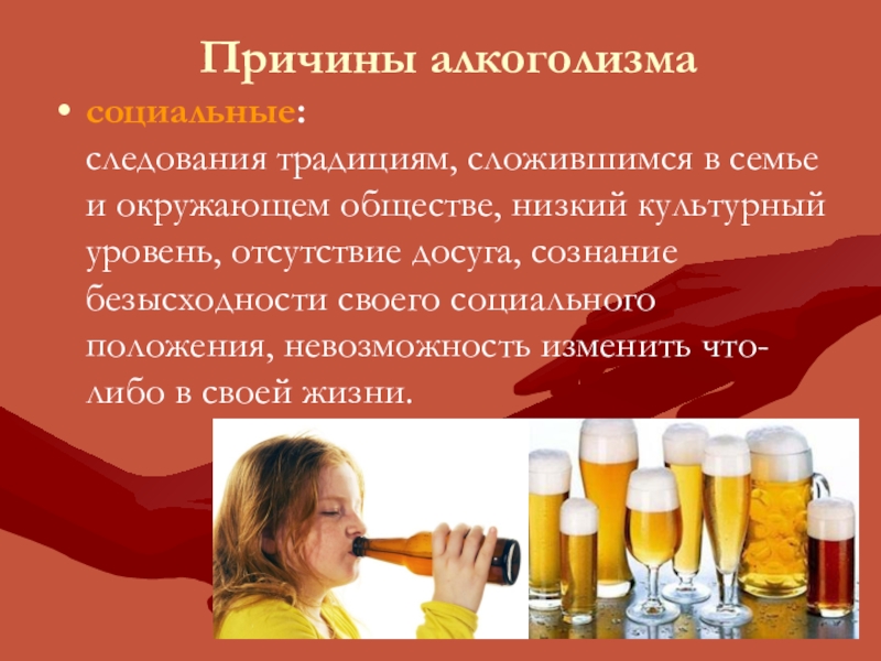 следования традициям, сложившимся в семье и окружающем обществе, низкий культурный уровень, отсутствие досуга, сознание безысходности своего социального положения, невозможность изменить что-либо в своей жизни.
