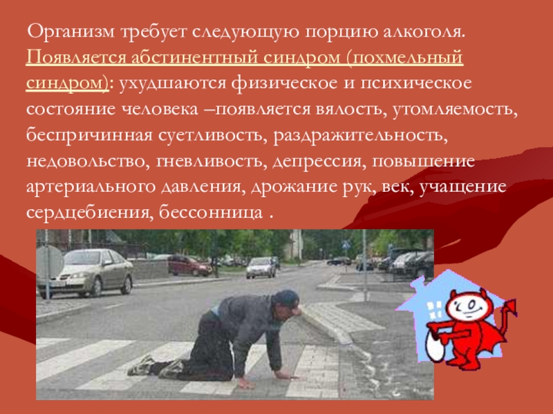 Появляется абстинентный синдром (похмельный синдром): ухудшаются физическое и психическое состояние человека –появляется вялость, утомляемость, беспричинная суетливость, раздражительность, недовольство, гневливость, депрессия, повышение артериального давления, дрожание рук, век, учащение сердцебиения, бессонница .