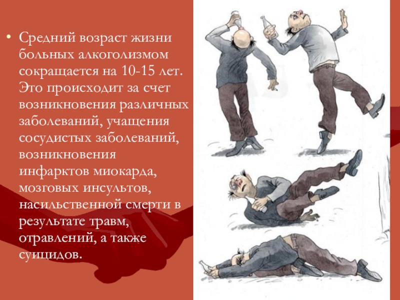 Слайд 11Средний возраст жизни больных алкоголизмом сокращается на 10-15 лет. Это происходит