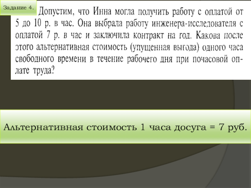 Анна имеет возможность получить с оплатой от 4 до 8 руб. в час в обычное рабочее время с 9 до 18 ч. Других возможностей получить работу она не имеет. Какова альтернативная стоимость одного часа свободного времени в интервале с 8 вечера до 8 утра?