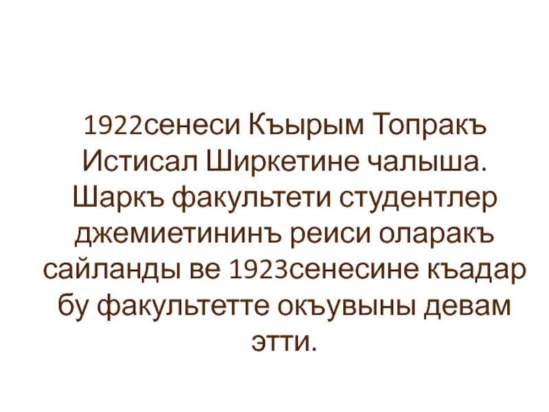 Слайд 81922сенеси Къырым Топракъ Истисал Ширкетине чалыша. Шаркъ факультети студентлер джемиетининъ реиси оларакъ