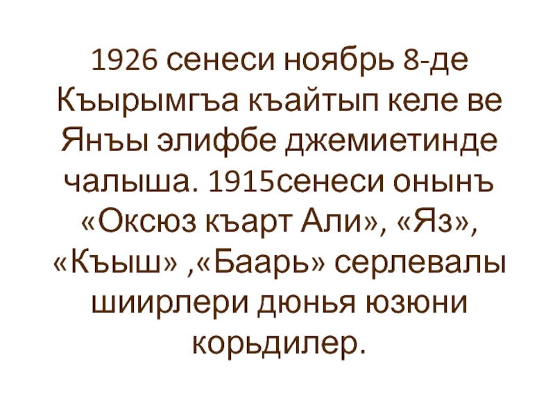Слайд 101926 сенеси ноябрь 8-де Къырымгъа къайтып келе ве Янъы элифбе джемиетинде