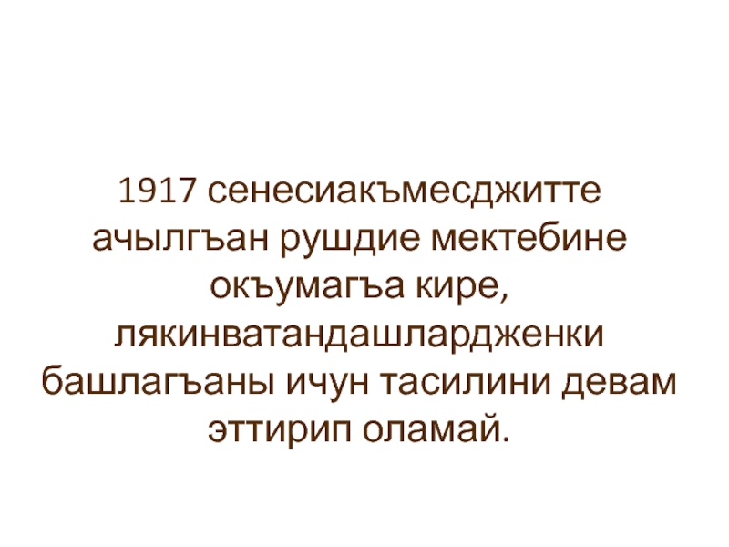 Слайд 61917 сенесиакъмесджитте ачылгъан рушдие мектебине окъумагъа кире,лякинватандашлардженки башлагъаны ичун тасилини девам