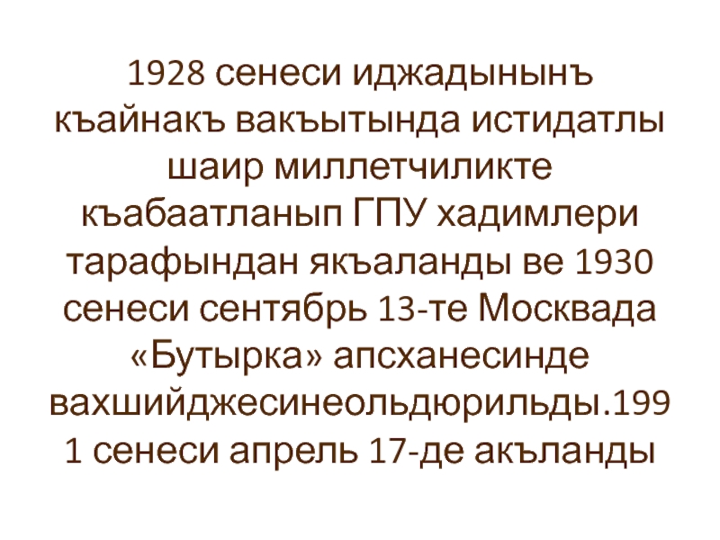 Слайд 111928 сенеси иджадынынъ къайнакъ вакъытында истидатлы шаир миллетчиликте къабаатланып ГПУ хадимлери