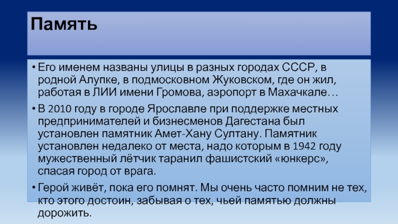 Впрочем, у советской власти к самому Амет-Хану Султану претензий не было. Как не было никогда претензий к ней и у самого аса, который считал себя именно советским человеком, интернационалистом и с равной теплотой относился к Крыму, Дагестану и Москве, ставшей его новым домом.