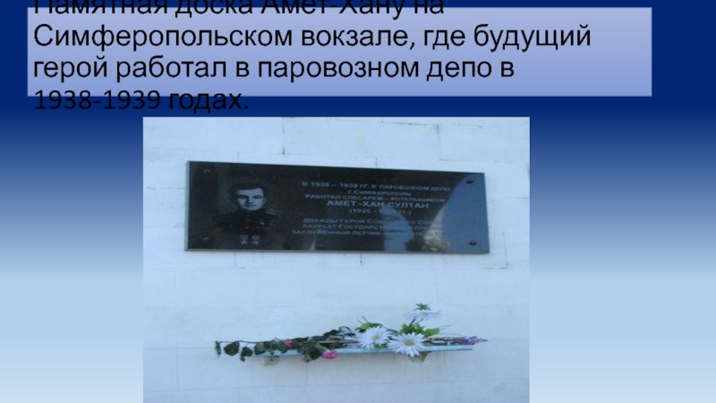 Слайд 15Памятная доска Амет-Хану на Симферопольском вокзале, где будущий герой работал в