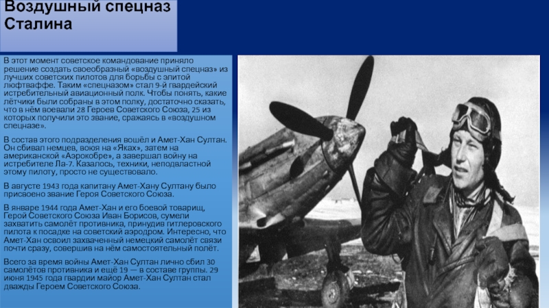 В состав этого подразделения вошёл и Амет-Хан Султан. Он сбивал немцев, воюя на «Яках», затем на американской «Аэрокобре», а завершал войну на истребителе Ла-7. Казалось, техники, неподвластной этому пилоту, просто не существовало.