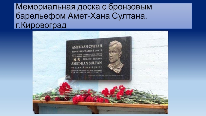 Слайд 16Мемориальная доска с бронзовым барельефом Амет-Хана Султана.