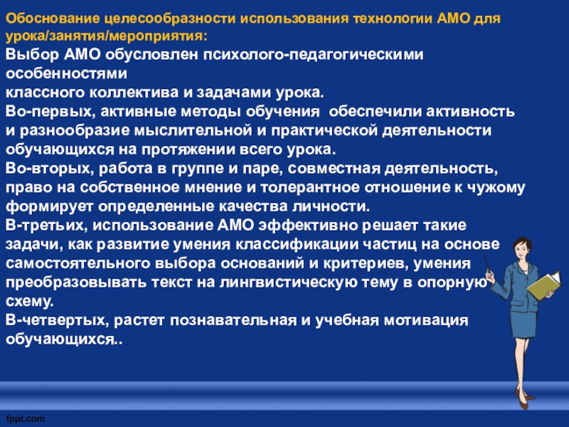 Слайд 21Обоснование целесообразности использования технологии АМО для урока/занятия/мероприятия:
