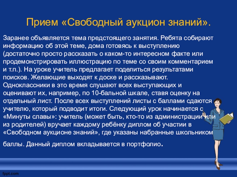 информацию об этой теме, дома готовясь к выступлению (достаточно просто рассказать о каком-то интересном факте или продемонстрировать иллюстрацию по теме со своим комментарием и т.п.). На уроке учитель предлагает поделиться результатами поисков. Желающие выходят к доске и рассказывают. Одноклассники в это время слушают всех выступающих и оценивают их, например, по 10-бальной шкале, ставя оценку на отдельный лист. После всех выступлений листы с баллами сдаются учителю, который подводит итоги. Следующий урок начинается с «Минуты славы»: учитель (может быть, кто-то из администрации или из родителей) вручает каждому ребёнку диплом об участии в «Свободном аукционе знаний», где указаны набранные школьником баллы. Данный диплом вкладывается в портфолио.