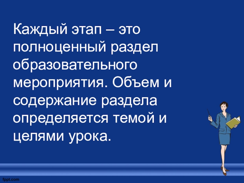 Слайд 10Каждый этап – это полноценный раздел образовательного мероприятия. Объем и содержание