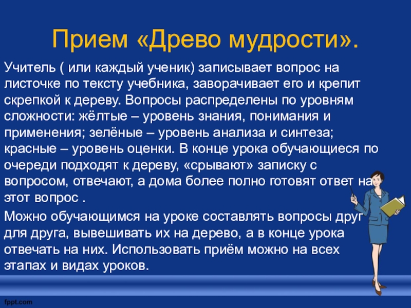 листочке по тексту учебника, заворачивает его и крепит скрепкой к дереву. Вопросы распределены по уровням сложности: жёлтые – уровень знания, понимания и применения; зелёные – уровень анализа и синтеза; красные – уровень оценки. В конце урока обучающиеся по очереди подходят к дереву, «срывают» записку с вопросом, отвечают, а дома более полно готовят ответ на этот вопрос .