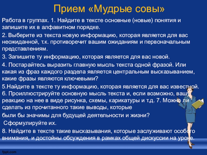 5.Найдите в тексте ту информацию, которая является для вас известной. 6. Проиллюстрируйте основную мысль текста и, если возможно, вашу реакцию на нее в виде рисунка, схемы, карикатуры и т.д. 7. Можно ли сделать из прочитанного такие выводы, которые