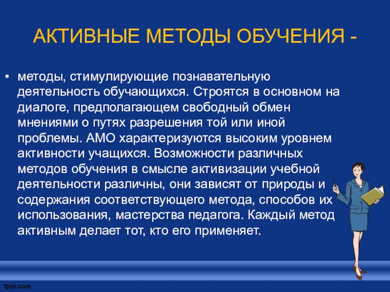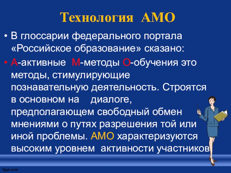 это методы, стимулирующие познавательную деятельность. Строятся в основном на диалоге, предполагающем свободный обмен мнениями о путях разрешения той или иной проблемы. АМО характеризуются высоким уровнем активности участников.
