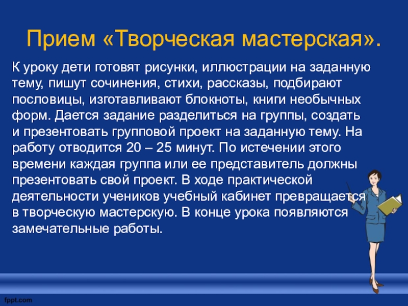 тему, пишут сочинения, стихи, рассказы, подбирают пословицы, изготавливают блокноты, книги необычных форм. Дается задание разделиться на группы, создать и презентовать групповой проект на заданную тему. На работу отводится 20 – 25 минут. По истечении этого времени каждая группа или ее представитель должны презентовать свой проект. В ходе практической деятельности учеников учебный кабинет превращается в творческую мастерскую. В конце урока появляются замечательные работы.
