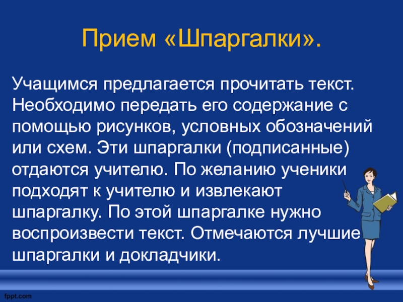 помощью рисунков, условных обозначений или схем. Эти шпаргалки (подписанные) отдаются учителю. По желанию ученики подходят к учителю и извлекают шпаргалку. По этой шпаргалке нужно воспроизвести текст. Отмечаются лучшие шпаргалки и докладчики.