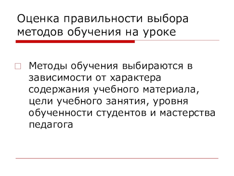 Выбор методов обучения на уроке является одним из важных и сложных этапов подготовки к уроку. При выборе метода, учителю необходимо учитывать цель урока, необходимый результат, содержание материала, знать и владеть основными методами обучения. Наряду с понятием «метод обучения» используется понятие «прием обучения». Принято считать, что метод обучения представляет собой совокупность приемов обучения. Планируя учебное занятие, необходимо предусмотреть использование различных приемов взаимосвязанной деятельности педагога и обучаемых.