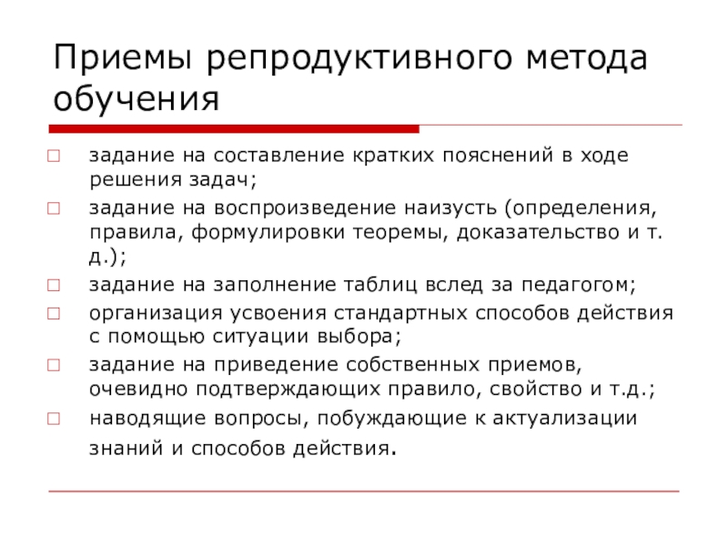 Репродуктивный метод основан на применении изученного по образцу, правилу, алгоритму