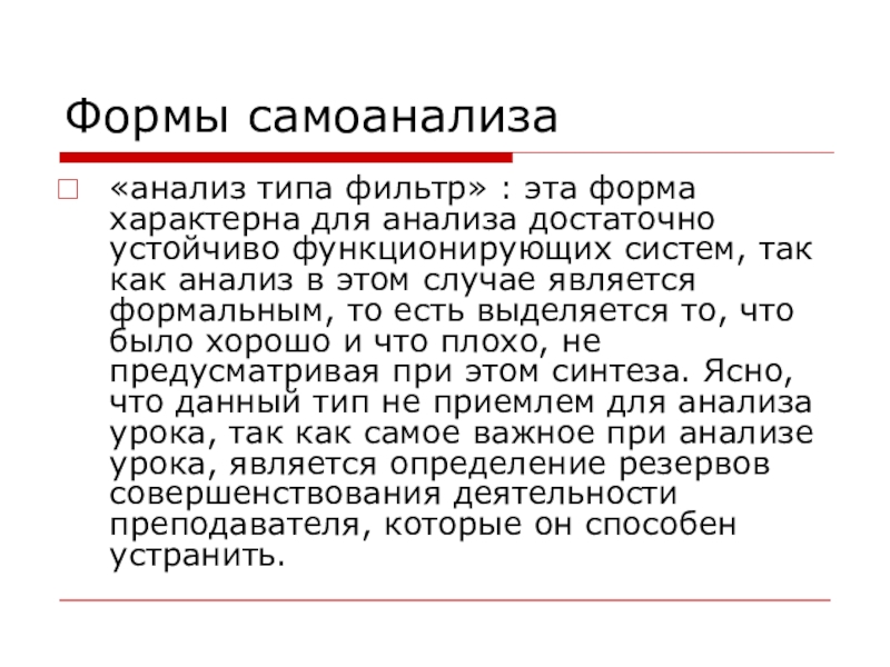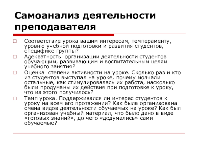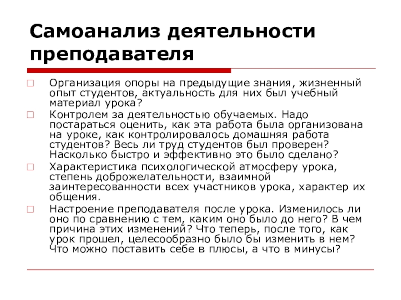 Очень важно в ходе анализа уроков подготавливать преподавателя к постепенному самоанализу уроков и рефлексированию своей деятельности.