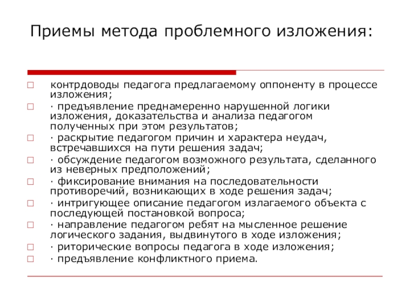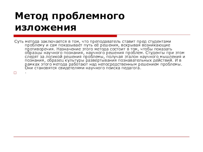 студентами проблему и сам показывает путь её решения, вскрывая возникающие противоречия. Назначение этого метода состоит в том, чтобы показать образцы научного познания, научного решения проблем. Студенты при этом следят за логикой решения проблемы, получая эталон научного мышления и познания, образец культуры развертывания познавательных действий. И в рамках этого метода работают над непосредственным решением проблемы. Они становятся свидетелями научного поиска педагога.