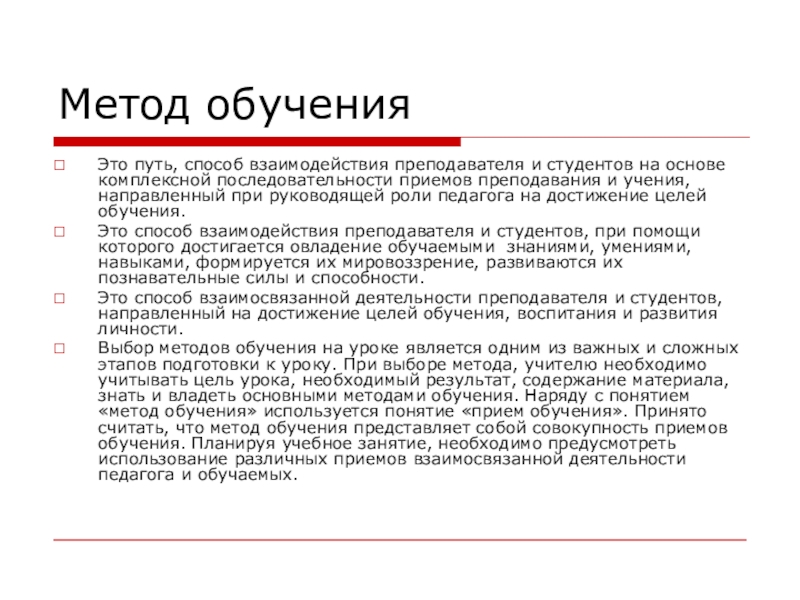 Это способ взаимодействия преподавателя и студентов, при помощи которого достигается овладение обучаемыми знаниями, умениями, навыками, формируется их мировоззрение, развиваются их познавательные силы и способности.